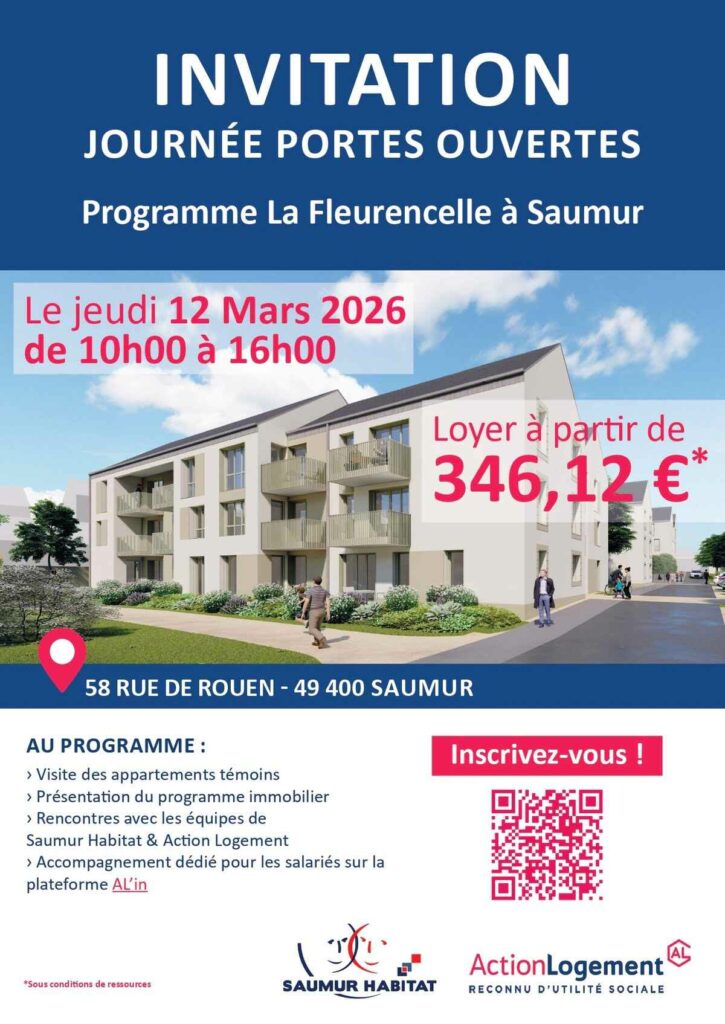 Saumur Habitat et Action Logement vous convient à la journée portes ouvertes du programme La Fleurencelle, le jeudi 12 mars 2026 de 10h00 à 16h00, à Saumur !